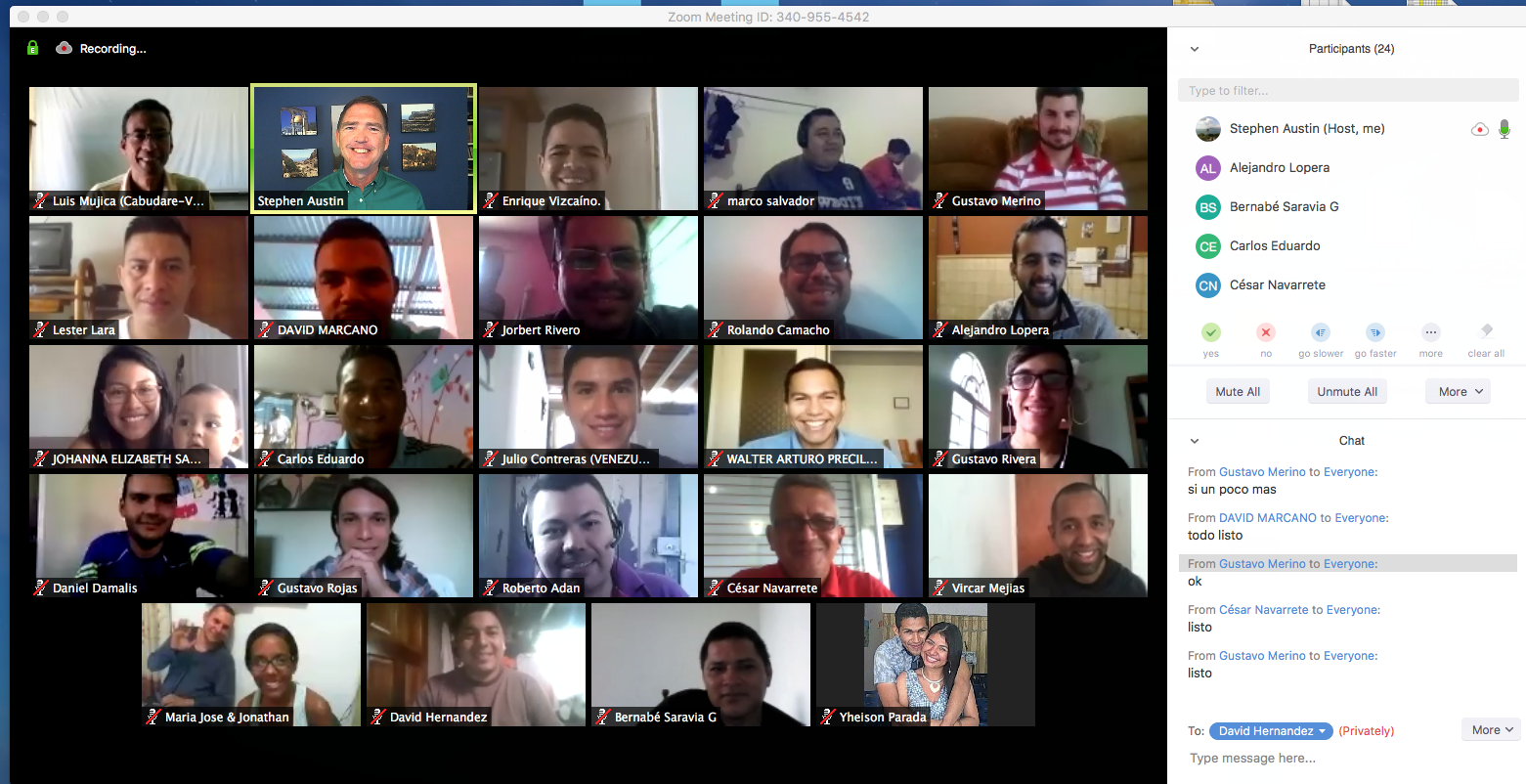 This is our classroom: Dr. Steve Austin leads a class of dedicated students via ZOOM. No more brick and mortar–just people eager to learn.
